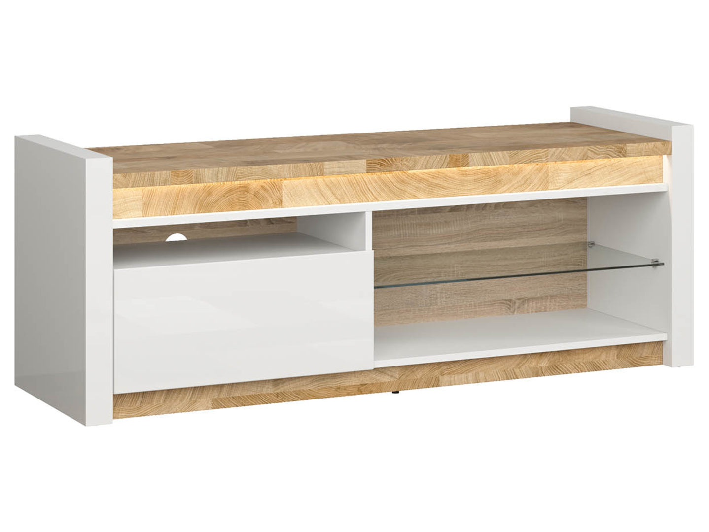 White Gloss TV cabinet with drawer and open glass shelf storage. A modern 1 drawer and 3 shelf TV Cabinet / Entertainment Unit, white high gloss body and fronts, with LED lighting included. Perfect to be used in your living room or bedroom. Ideal contemporary storage solution with soft closing system. LED lighting will add wow factor to any interior. Quality furniture from premium Alameda range manufactured by Black Red White.