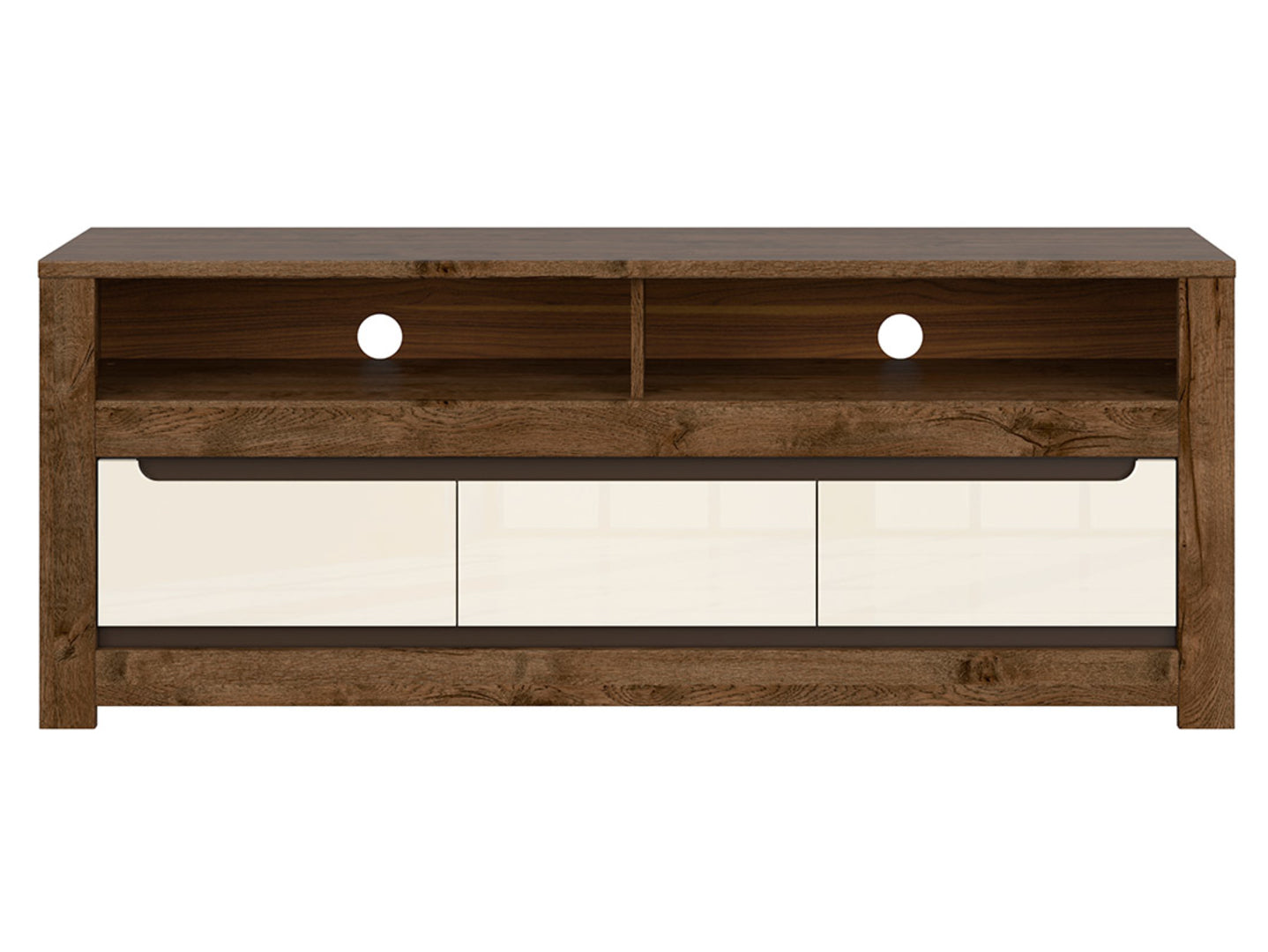 - The cabinet's decoration under the TV includes plinths and front cutouts, which serve as handles.
