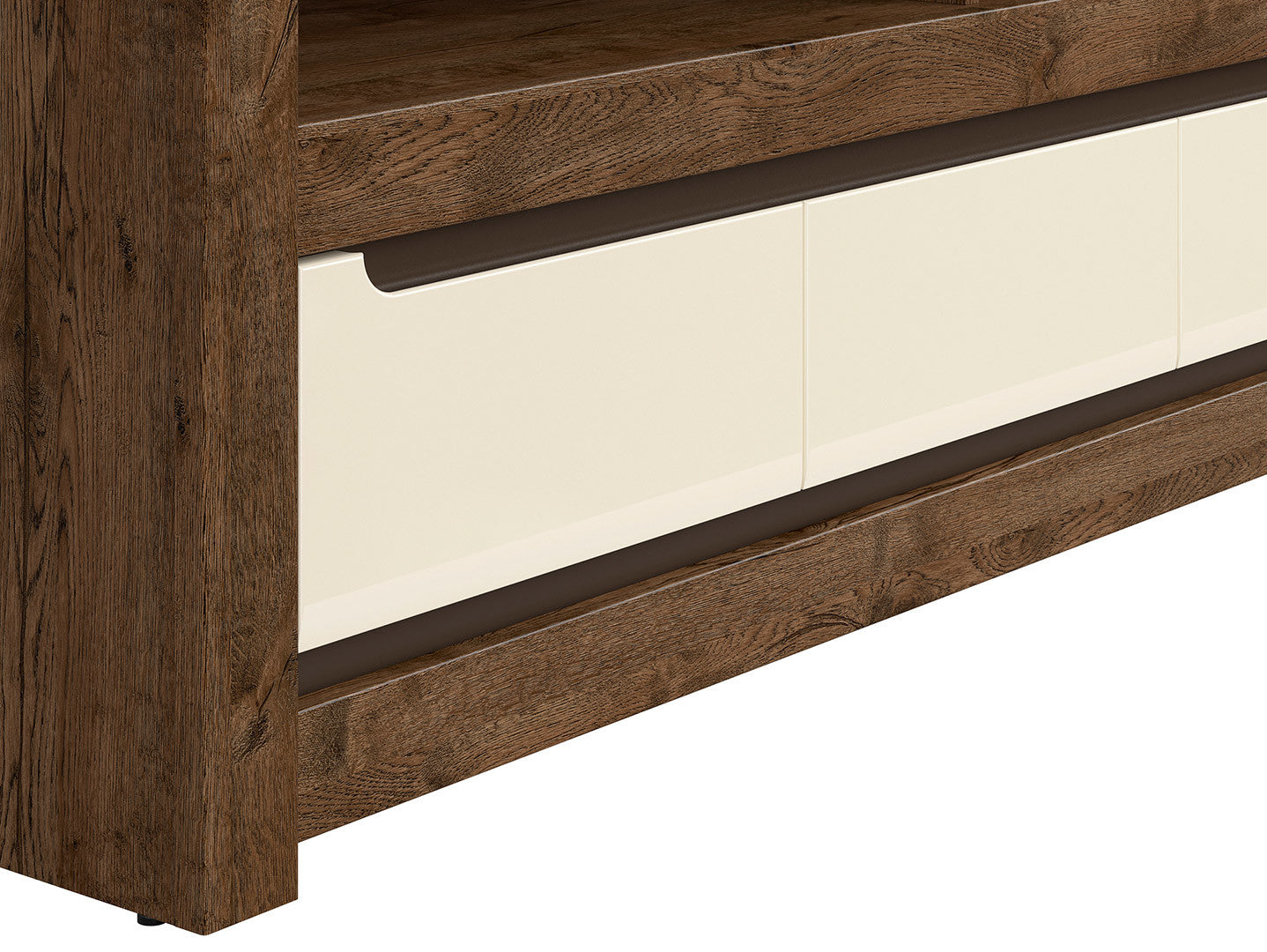 - The light fronts in pearl high gloss are a contrast to the dark April oak body. The visible wood grain showcases the natural beauty of the wood.
